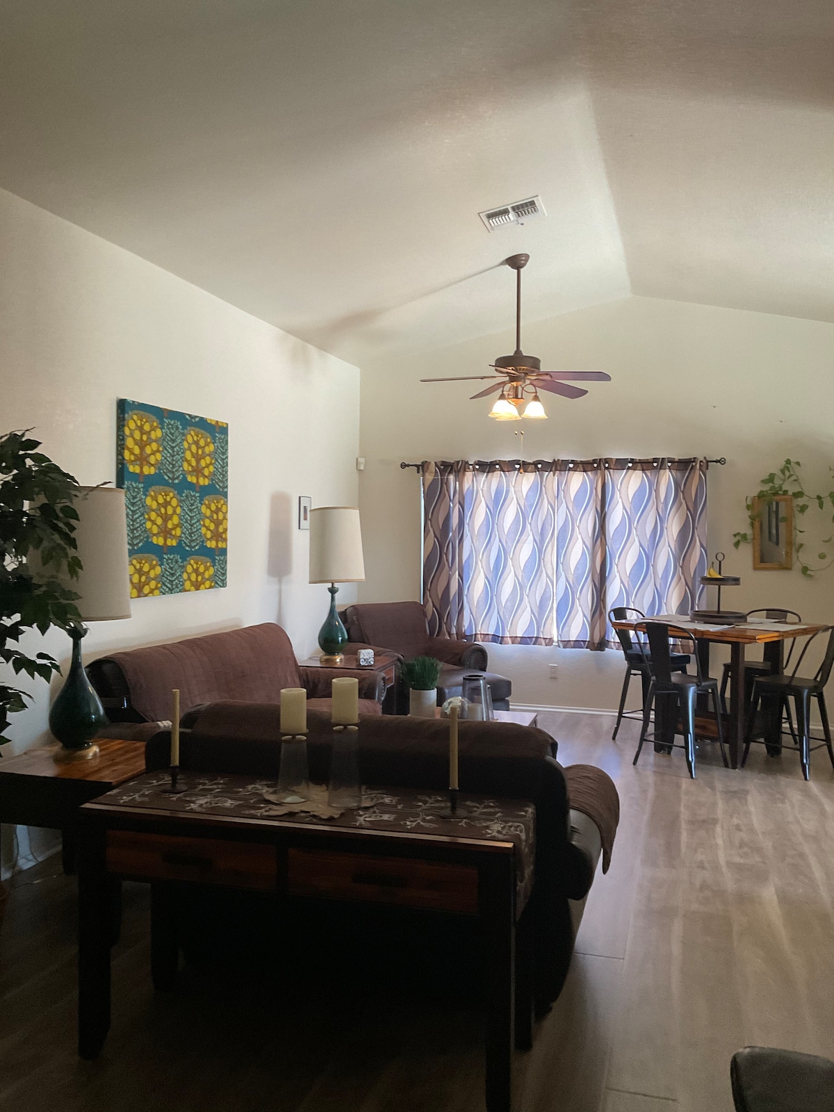 The Agave Stay is our welcoming home away from home, thoughtfully designed with modern furnishings & 1,115 sqft of comfort. Enjoy mornings at the coffee bar equipped with both a Keurig & regular coffee pot, Wi-Fi and the convenience of an in unit washer/dryer. Unwind in your own fully fenced in backyard & cool off in the community pool just across the street. Our home is pet friendly to two mature, well-trained dogs with a $25 per day, per dog fee. (Please clean up after your pup)
