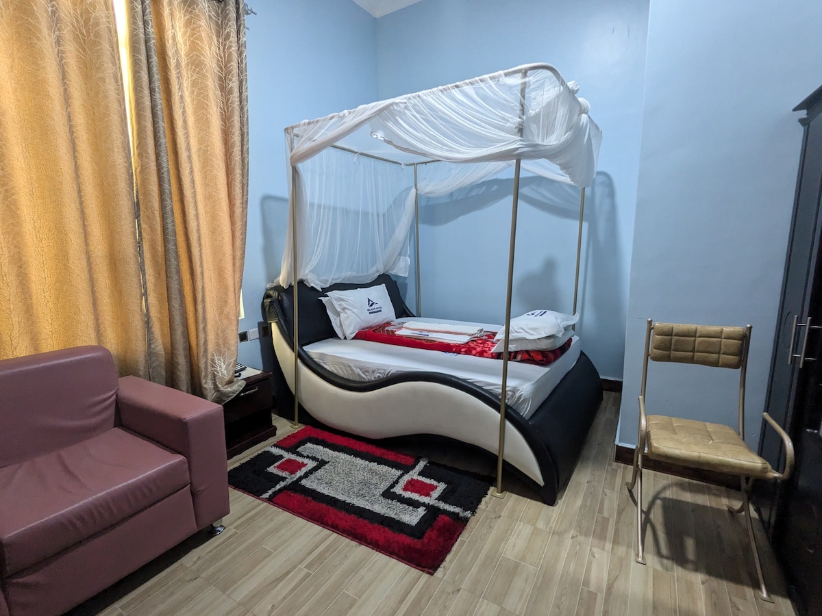 You are gladly welcome to our home, it's a banglow house with 2 guest rooms and 1 private bathroom with cold shower water( am sure you won't opt for hot water due to the hot climate here. We have a huge compound good for small events and car parking. we also have a car that will take u place at a cost ofcourse 😄. You will only have a private room and shower but share the kitchen and sitting room with my family of 3 people. We can't wait to have you ❤️