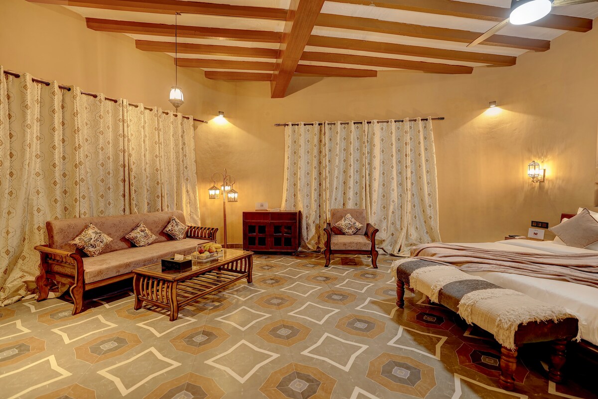 Nestled in a forest‑surrounded 12‑acre resort — a rustic‑Mediterranean suite awaits amidst fruit‑and‑vegetable gardens, offering peaceful reprieve. Relax in a cozy 322 sq.ft. cottage‑style room with a king‑size bed, wooden accents, soft lighting, private patio, and a terrace with serene views. Enjoy poolside lounging, two expansive gardens each of 1-acre approx., a tree‑house machan, and Tuscan‑style dining. Ideal for families, couples.
