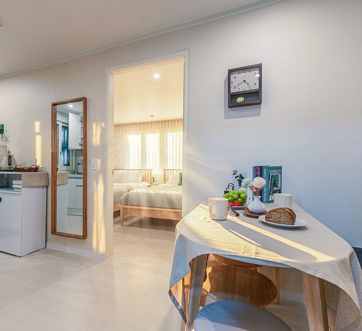 💜 신축건물 조용한 주택 2층 입니다. 💜 깨끗하고 사랑스런 컨셉의 퀄리티있는 숙소를 거품없는 가격으로 제공하고 있습니다. 💜 23평 넓고 쾌적한 공간. 호텔식 침대 및 침구. 6인 대형 테이블이 마련된 독립 다이닝룸. 50인치 스마트 TV (유튜브, 넷플릭스, 티빙 개인계정 시청가능) 💜 예약인원 외 추가인원 입실 불가. 적발시 환불 없이 즉시 퇴실 조치 (방문인원 입실불가 ) ※ 공동현관 CCTV로 체크합니다. 💥1~2인 예약시 : 침실1 또는 침실2 중 선택 (기본 침실1 제공) 제공외 침실 CLOSED 침실1, 2 모두 사용시 1박당 3만원 추가요금 발생 💥 3인 예약시 : 침실1 + 침실2 (슈퍼싱글 침대) 💥 4인 예약시 : 침실1 + 침실2 (슈퍼싱글+싱글침대)