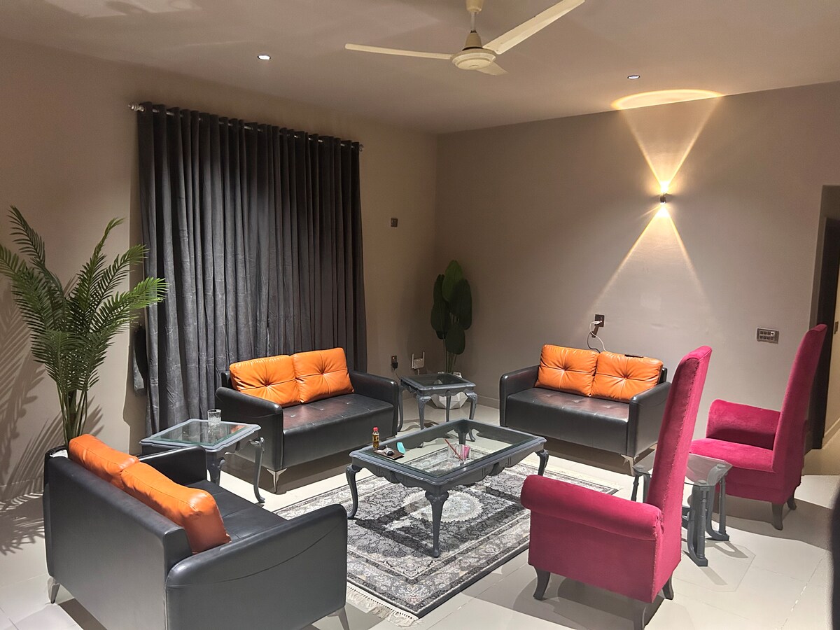 Dobro došli u naš mirni bungalov sa 2 spavaće sobe u Gulistan-e-Johar - samo 10 minuta od aerodroma Karači! Idealan za porodice, poslovne putnike ili vikend-putovanja, naš potpuno privatni smještaj spaja udobnost, bezbjednost i lokalni štih. 🏠 Nalazi se u ograđenom društvu – bezbjedno i tiho ❄️ 2 moćne klima-uređaje ⚡ Rezervni generator – bez brige o uklanjanju tereta 🌐 Brzi Wi-Fi 🛏️ 2 spavaće sobe (povezana kupatila) 🛋️ 1 salon (treća soba) uključuje kauč + trpezarijski sto za 6 osoba 🍽️ U potpunosti opremljena kuhinja