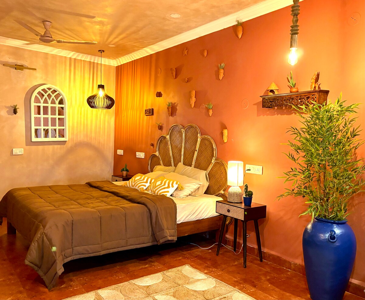 Our Signature Room is a design-forward space featuring a King bed, an open to sky bathroom, and a bathtub blending comfort with thoughtful aesthetics. The room is equipped with high-speed Wi-Fi, air conditioning, and a smart TV for a seamless stay. Located just 1.5 km from the beach and 900 meters from the local market, the property offers easy access while remaining a peaceful retreat. Our spaces are intentionally designed to foster community, creativity, and authentic travel experiences.