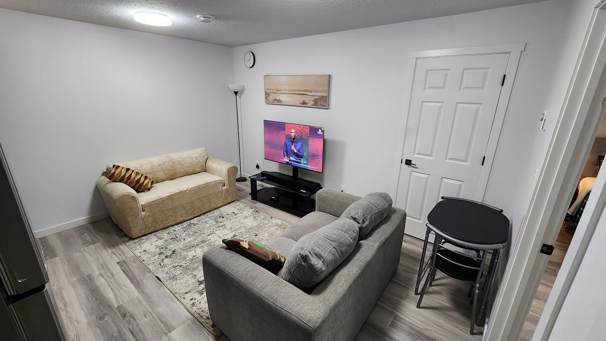 Uživajte u udobnosti i praktičnosti koje ovaj udobni podrumski apartman nudi u mirnom zelenom području. Stvorite uspomene u ovoj jedinstvenoj vili prikladnoj za porodice. Udaljen je 5 minuta vožnje od Kostkoa i 8 minuta vožnje od prodavnice Walmart & Superstore. Ovaj izuzetno čist prostor ima udoban bračni krevet i besplatan parking. Ima brzi internet 325 Mbps Wi-Fi, pametni TV od 40inča, uključujući vrhunski video i pristup Netflix-u. Čajna kuhinja ima osnovnu opremu kao što su mikrotalasna rerna, frižider, bokal za toplu vodu, aparat za kafu, toster.