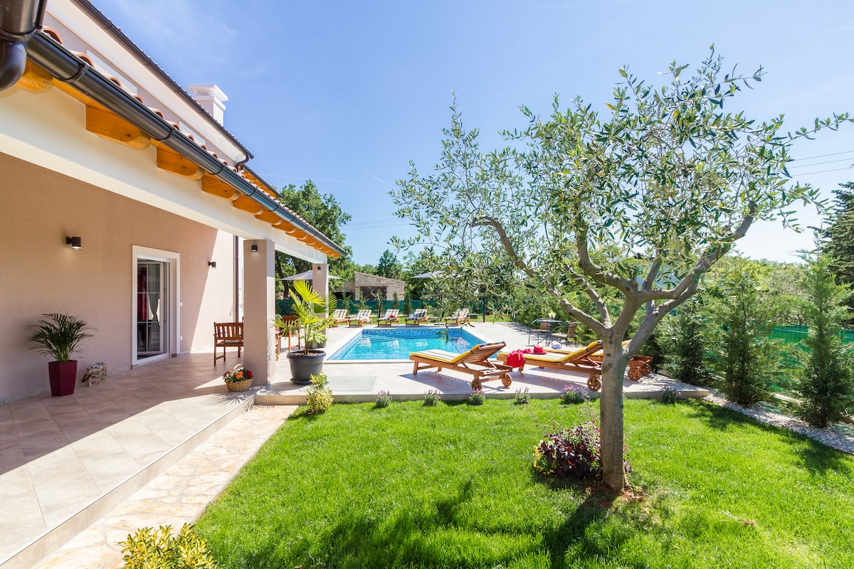 Vila je moderna i nova vila na mirnoj i privatnoj lokaciji, ali nedaleko od mora 8 km. i grad Pula udaljen 7 km Veliki, privatni, grijani bazen sa vodopadom i barom pored bazena je čisti luksuz. Na natkrivenoj terasi za ručavanje možete da ispečete svoje specijalitete, koje možete da pripremite u ljetnjoj kuhinji na roštilju.
