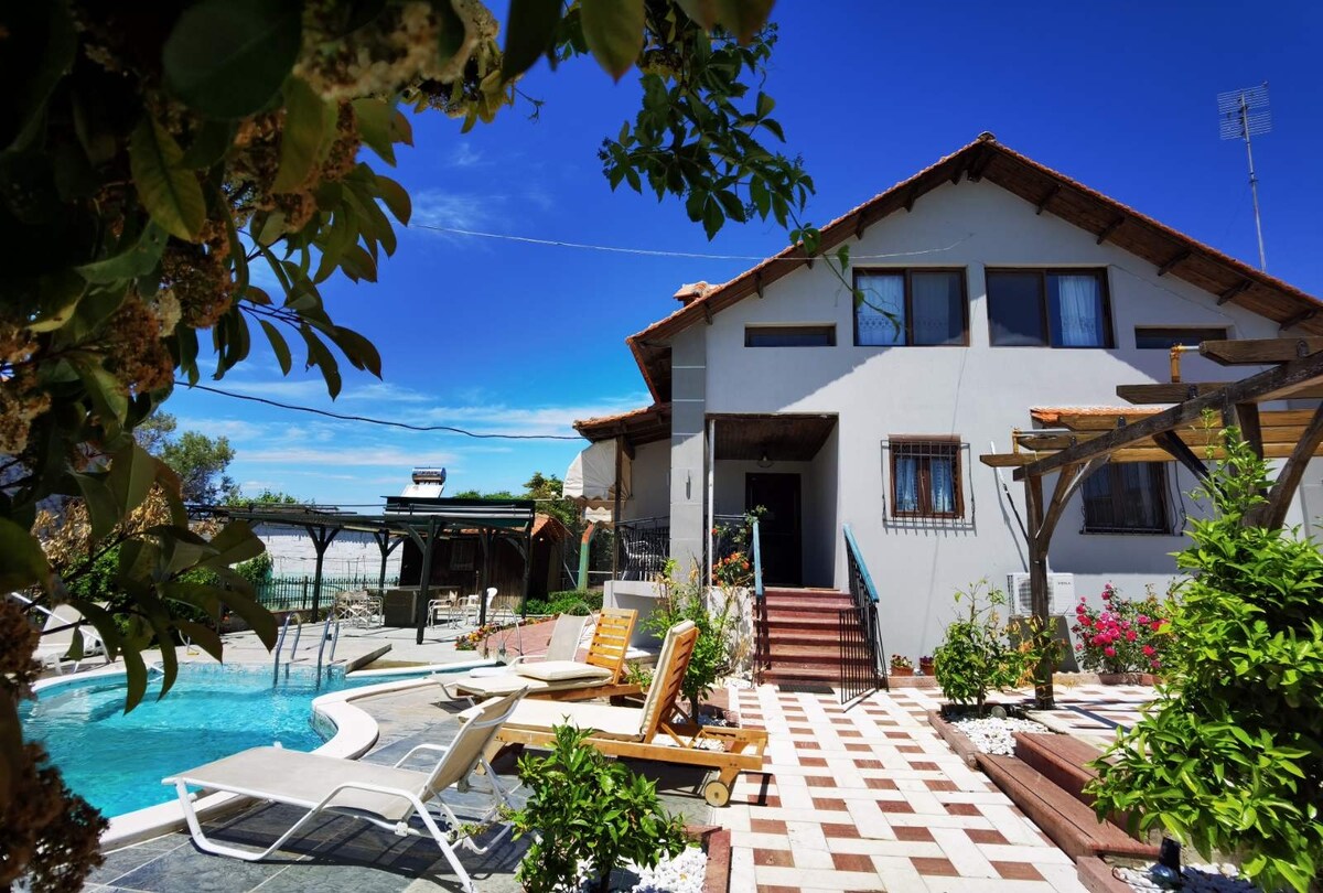 Luksuzna vila sa privatnim bazenom na Chanioti-Chalkidikiju. Bazen je zagrejan, ima slanu vodu i privatan je samo za našu kuću. Na drugom spratu imate zadivljujući pogled na more i planinu Sitoniju, kao i predivnu prirodu sa maslinama. Selo Čanioti (Hanioti) i predivno more i plaže udaljeni su 10 minuta hoda ili oko 900 metara u predivnoj prirodi. Još 400 metara do plaže. Takođe je moguće hodati/voziti bicikl u planinama i pored mora.