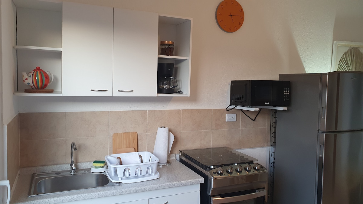 Disfruta de una estancia relajante en esta bella casa de 2 habitaciones, ideal para quienes buscan tranquilidad y confort. Ubicada en un entorno tranquilo, ofrece una linda área verde perfecta para descansar al aire y disfrutar de paz y privacidad. Cuenta con parqueo privado, AC para mantener la temperatura perfecta, cocina completamente equipada, lista para preparar tus platillos favoritos y un baño moderno y funcional. Para estadías cortas o largas, esta es tu mejor opción. ¡Te esperamos!