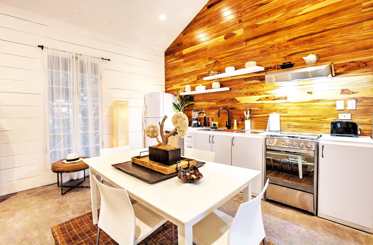 The White Cottage is part of "Ginger & Cacao", a sanctuary like property of one acre of lush jungle and gardens, at 300 m from Punta Uva beach. Large verandas with ocean views, open floor design interior, air conditioning, full kitchen, full bath and spacious walk-in closet define the cottage. For more details on the cottage, property layout and multiple options to rent, please see The Space section below.