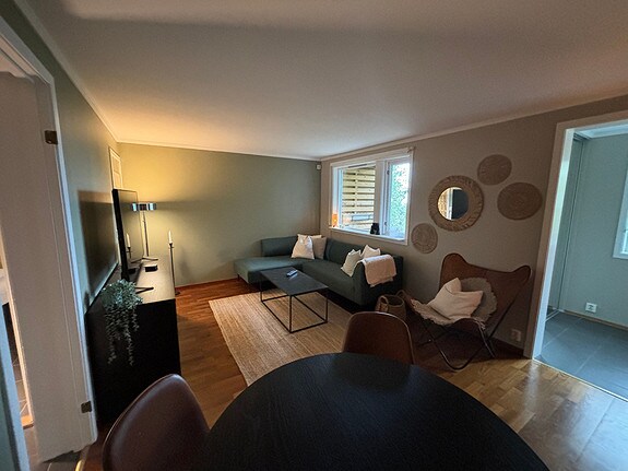 Lep stan. Svetao i prijatan, sa dobrim pogledom na Oslo. Najbolje je pristupiti automobilom. Stan je u potpunosti namješten, uključujući posteljinu i peškire(pranje i promjena na krevetima i peškirima je naknada za čišćenje) Uključuje ulazni hodnik, dnevni boravak, 2 spavaće sobe, kuhinju, kupatilo i ostavu. Kratka udaljenost do: Stovner centra sa svim sadržajima, metro i autobuska stanica, planinarski teren. Parket u dnevnoj i spavaćoj sobi, pločice sa kablom za grijanje na preostalim podovima. Privatni parking za automobil. PUNJENJE NIJE MOGUĆE.