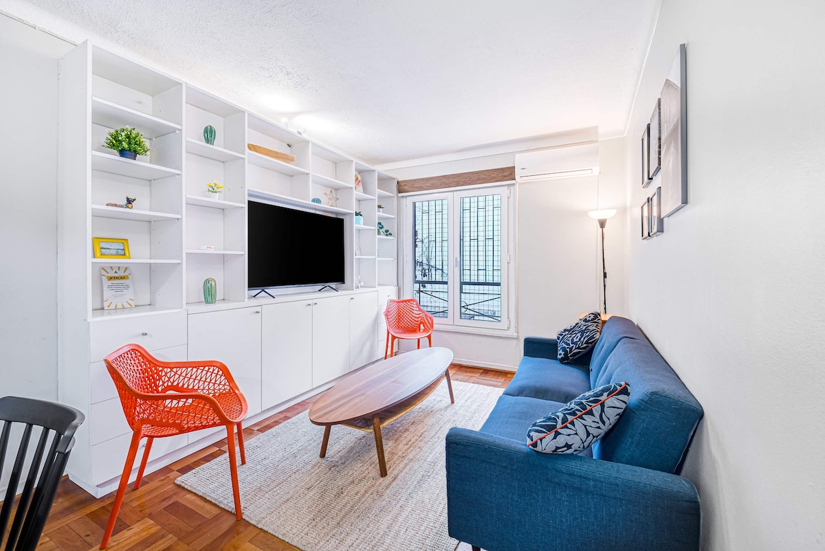 Departamento (Piso 4) remodelado, ventanas termo panel, excelente equipamiento. Ubicado a una cuadra de la principal línea de metro, en el mejor sector turístico de Santiago. Barrio muy seguro, ubicado en una calle tranquila, sin ruido. A pasos de parques, teatros, pubs, restaurantes, centros comerciales, supermercados y más. ** A pasos del Costanera Center y el Metro. ** Tv incluye solo Netflix e internet ** Sin malla de protección para niños ** Sin estacionamiento