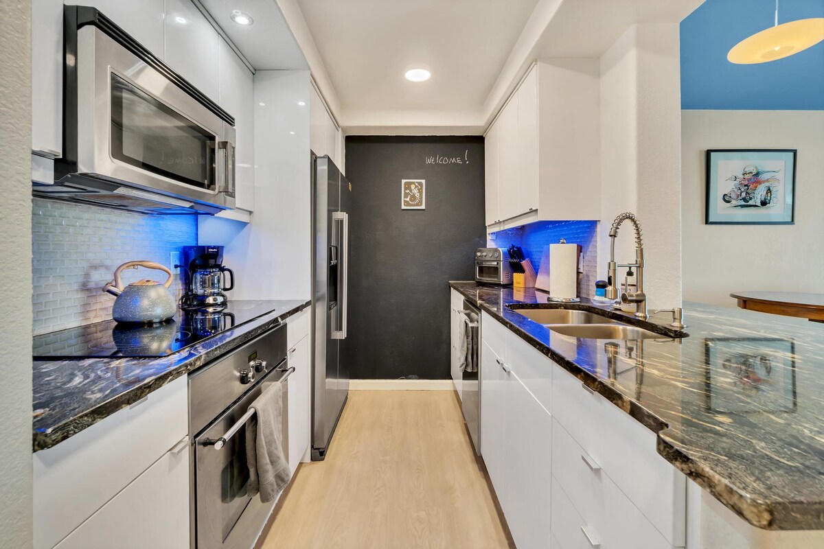 This modern escape is bustling with stylish decor and lovable amenities. From brand-new TVs, a dedicated workstation, blazing-fast wifi, travel essentials, and a bar cart to a fitness center and grills, this unit makes you feel right at home. It sleeps a total of 4 people with 1 king and 1 queen bed plus a couch. A short walk to Larimer Square, Union Station, Coors Field, and all that downtown Denver has to offer. Only a 2 hour drive to the mountains and ski country.