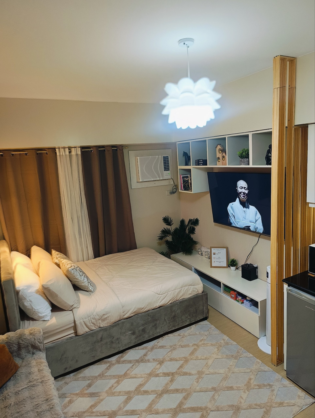 Ova jednosobna jedinica nalazi se na 22. spratu Aeon Towersa, arhitektonskog remek-djela koje se nalazi u blizini centra Davao Sitija. To je visokotehnološki i luksuzni kondominijum koji vam pruža najbolju udobnost, praktičnost i bezbjednost u kondominijumu. Osnovna cijena je za 2 gosta, ali možemo imati najviše 5 gostiju (Dodatni iznos od 500 PHP po osobi će biti naplaćen za više od 2 osobe.). Ovaj jedinstveni smještaj ima sopstveni stil.