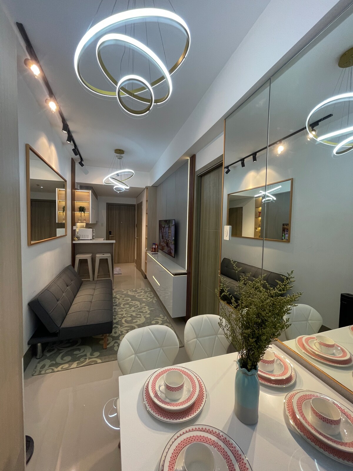 Horizen Doživite modernu udobnost u našem potpuno opremljenom porodičnom apartmanu sa 1 spavaćom sobom u Fame Residences Tower 1, Mandalujong. Samo nekoliko minuta hoda od SM Megamal, Shangri-La Plaza i Greenfield District, to je idealno urbano utočište. Smješten na visokom spratu, uživajte u veličanstvenom pogledu na sadržaje i horizont Makatija. Jedinica ima potpuno opremljenu kuhinju, udoban dnevni boravak i mirnu spavaću sobu za ugodan boravak. Savršeno za porodice i gradske istraživače!