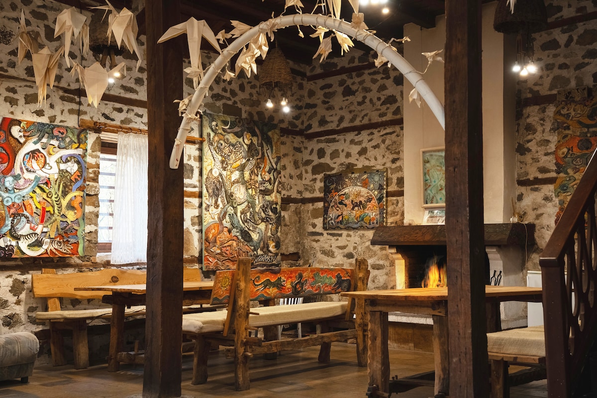 Art House is a guesthouse located in the rhodopean mountain city- Smolyan, which is near the famous ski resort Pamporovo (15km). Kuća ima jedinstven dizajn. To je stara zgrada u tradicionalnom bugarskom stilu sa zaista modernim elementima enterijera: umetničkim instalacijama, umetničkim delima i skulpturama. Kuća je prostrana - dvospratna zgrada sa malom bujnom i zelenom baštom. Ima pet soba i dva velika zajednička prostora. Sjajan je za velike grupe prijatelja, proslave i zabave.