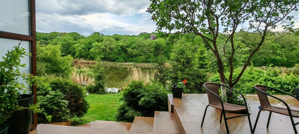 Family Villa Lake View in Moara Vlăsiei, Ilfov, nudi prostrani dnevni boravak s velikim prozorima koji vode na terasu s pogledom na jezero i šumu. Ima 3 spavaće sobe, 3 kupatila, veliki dnevni boravak sa otvorenom kuhinjom i 3 terase, od kojih jedna ima direktan pristup jezeru. Smješten u rezervatu „Natura 2000”, ima parking, podno grijanje, klima-uređaj, električni kamin, Smart TV, internet i potpuno opremljenu kuhinju. U blizini gosti mogu da uživaju u planinarenju u šumi, biciklizmu i ribolovu.