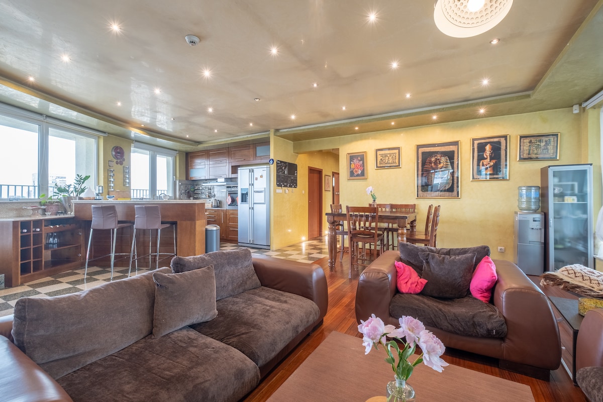 Uživajte u eleganciji i prostoru panoramskog penthausa sa 4 spavaće sobe dok boravite u Sofiji. Pažljivo uređeni i sa suncem obasjanim jutarnjim satima, đakuzi kadom, unutrašnjim i spoljašnjim balkonima sa pristupom iz svih spavaćih soba. Nema potrebe da hodate više od jednog bloka da biste pronašli nešto što tražite dok boravite ovdje. Penthaus ima pristup apoteci, supermarketu, prodavnici, tržnom centru, teretani, taksijima i još mnogo toga.