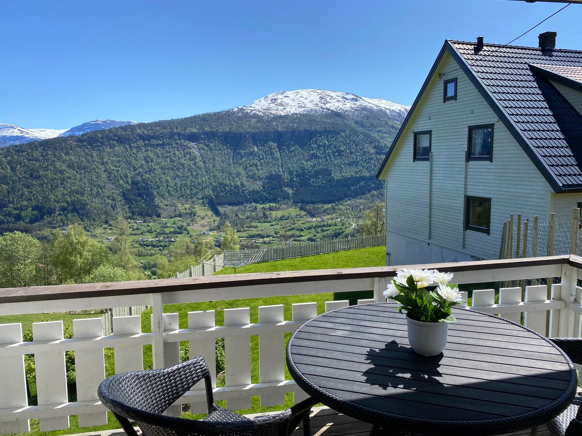 Udobna i prostrana kuća pored fjorda. Dođite uživo i opustite se u našem malom organskom vinogradu i farmi voća u Leikangeru pored prelijepog Sognefjorda. Kuća je potpuno opremljena sa svime što vam je potrebno. Privatna terasa na otvorenom i pergola za opuštanje i uživanje u večeri i piću. Dobra lokacija za planinarenje, plivanje i aktivnosti na otvorenom. Ili jednostavno uživajte u bašti, pogledu i lijepoj šetnji uz obalu fjorda. Ovo područje takođe ima nekoliko zanimljivih istorijskih znamenitosti koje treba istražiti. Dobro došli!
