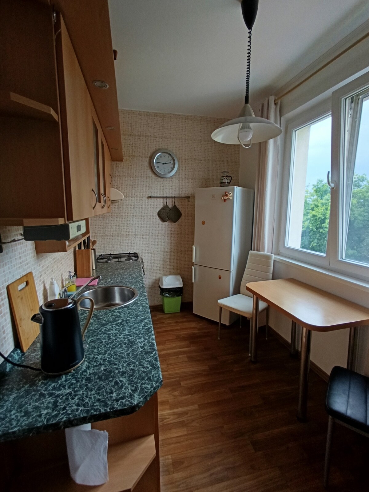 Sunny attic apartment in a quiet part of the city near the center and the forest. The bedroom offers a double bed with a size of 2x2m. There is a sofa in the living room, which can be expanded to a size of 190x150 cm and allows two more people to sleep. In the living room there is a kitchen with stove, sink, refrigerator, dishes. The apartment has wifi and two televisions. The bathroom has a small wooden sauna for max. 2 people. The toilet is separate. You are in the center in 5 minutes on foot.