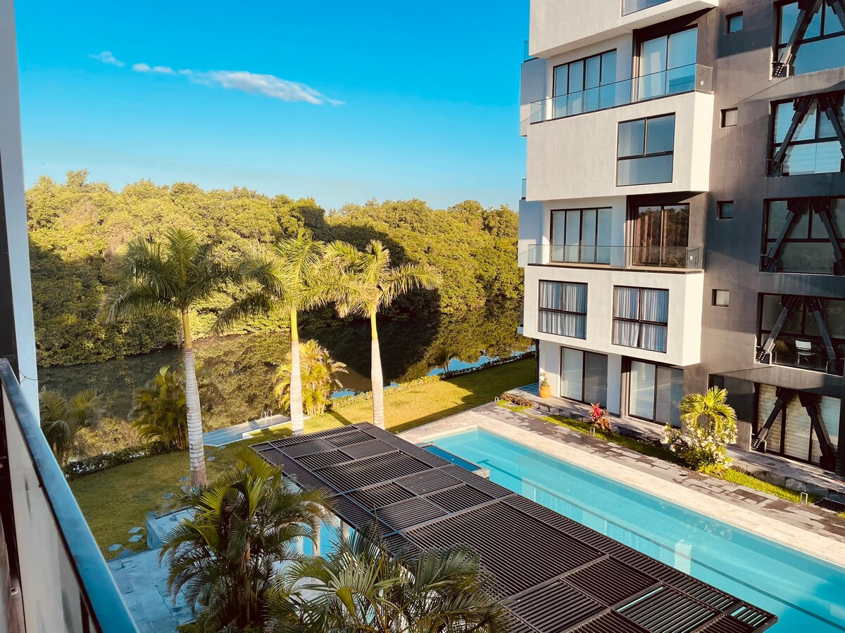 Ekskluzivni stan uz okean sa prelijepim namještajem i dizajnom. 20 metara od plaže, sa bazenom i teretanom. Uživajte u svim sadržajima, internetu, zvučnom sistemu, TV-u, opremljenoj kuhinji. Odlično za vikend pauzu. Osmišljeno za ljude koji cijene udobnost, odmor i dobar život. 10 minuta od tržnog centra Dorado i bogatih restorana i turističkog područja rivijere Verakruz.