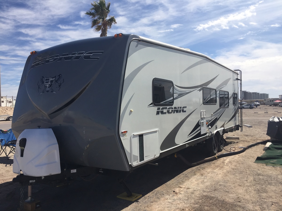 #9 SITE Full Hook Ups Space on the Beach ideal for Motor Home from 20 to 25 ft in a safety and private property Victors RV Park in Sea of Cortez, San Felipe, Baja California. we also have Dry Camp Area & Hotel Rentals. Sa kirijom lokacije koja uključuje 2 osobe 1 kamp prikolicu ili kamp prikolicu, lokacije imaju kompletne priključke od 30 ampera Električna, slavinu za pitku vodu, priključak za kanalizaciju, imamo kupatila i prostor za tuširanje za našeg gosta u kamperu, kao i WI-FI.