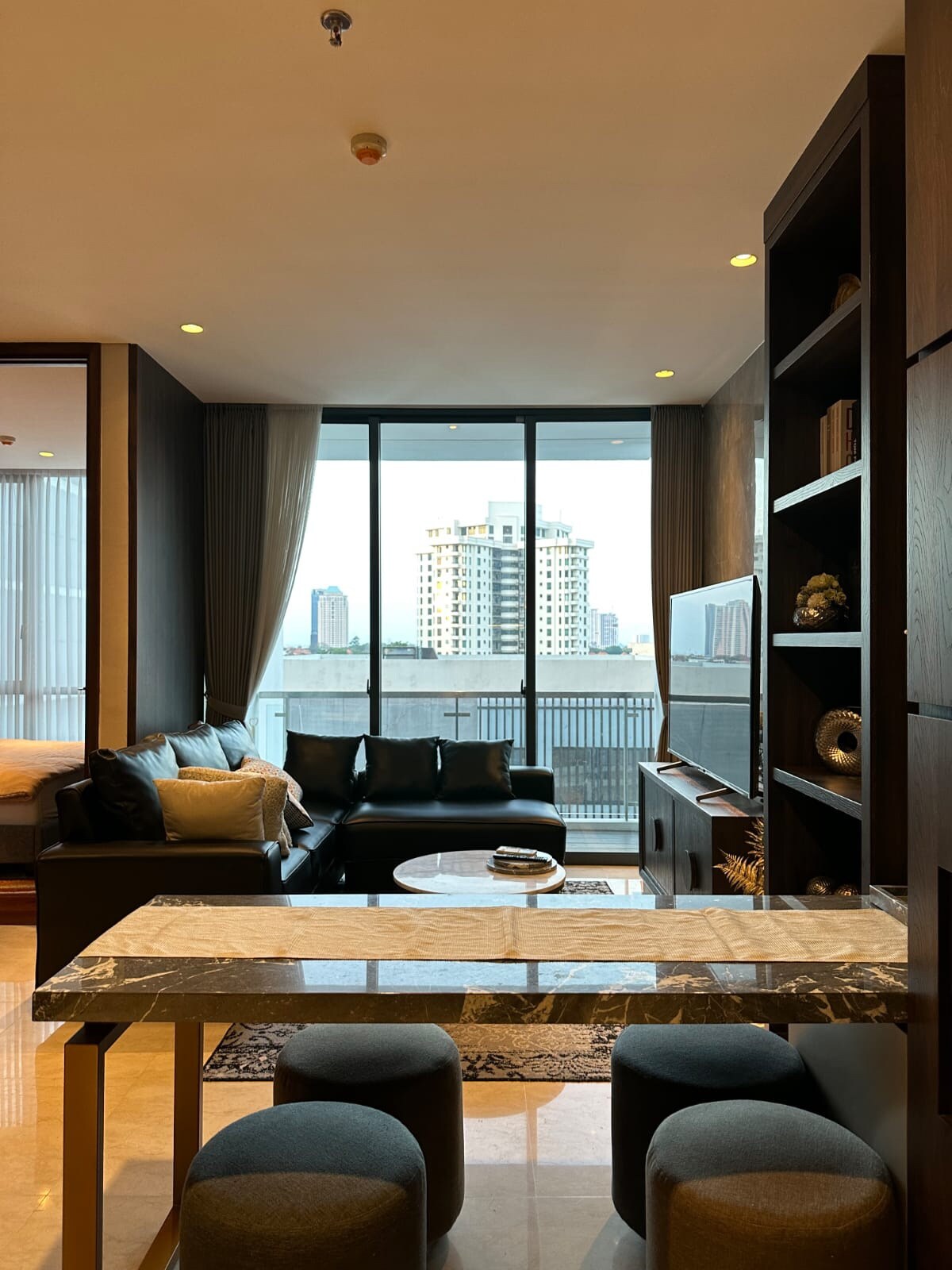 Apartemen Tanglin Studio Plus 29m2. City View. - Queen Bed - Air Conditioner - Water Heater - Hair dryer - Unlimited Wifi - Android TV 43 inch - Netflix - Clock - Dressing Table - Wardrobe - Writting Table - Bed side table - Folding Dining Table - Pantry Cabinet - Rice Cooker - Steinlees Steel Sink - Refrigerator - Hot/Cold Dispenser mineral water - Electric Induction Cooker Hob - Cooker Hood - Induction Fry Pan, bowl, plate, glass, etc. Note: during the stay there is no cleaning service