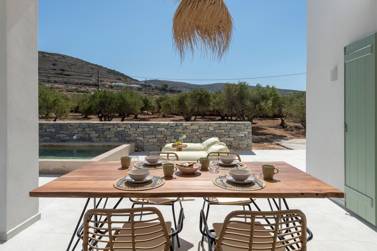 U blizini Parikije (glavnog grada) i Pounda (trajekt za Antiparos), ova vila od 180 kvadratnih metara nudi zadivljujući pogled na planine i more. Smješten u mirnom poljoprivrednom području, 3 km od Parikije, osigurava potpunu privatnost sa prostranim spoljnim prostorima i velikim bazenom. Skrivena staza vodi do pješčane plaže Parasporos. Pažljivo uređena od strane vlasnika, vila spaja principe feng šuija sa tradicionalnim elementima, prirodnim materijalima i umirujućim tonovima kako bi stvorila mirno utočište.