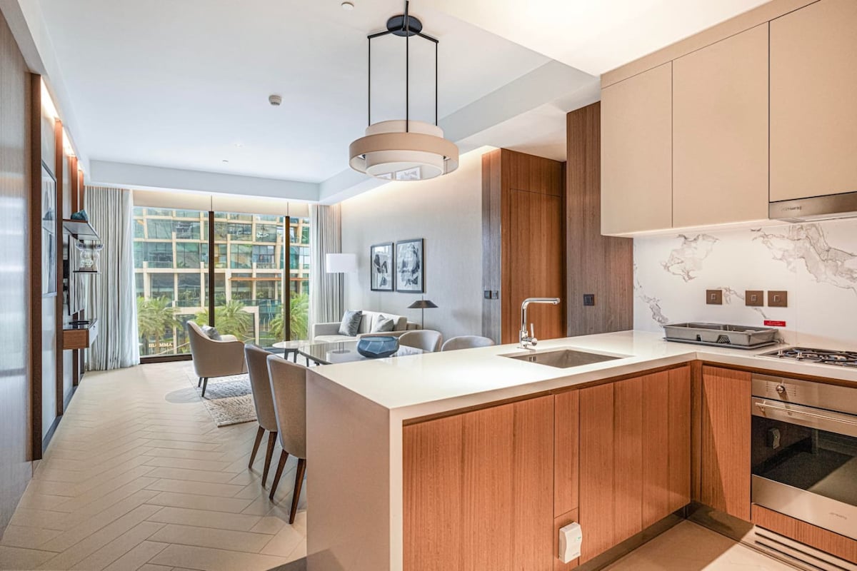 Welcome to our 2-bedroom Seraya residence at The Grande, where the comfort of a private residence meets 5-star hospitality services and amenities. Located in the heart of Dubai, just in front of Dubai Opera, this residence offers 180-degree views of the Burj Khalifa and Dubai Fountain. It features custom-made interiors, a spacious living room, a fully equipped kitchen, and unmatched views throughout.