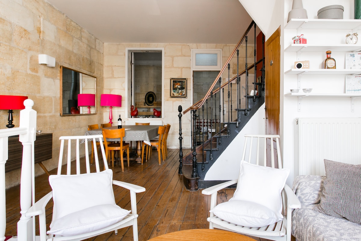 Naš dom se nalazi na izuzetnoj lokaciji u ulici Place des Chartrons, poznatom po autentičnom seoskom životu u srcu grada. Cela kuća će biti vaša za uživanje! Probudite se ujutru sa prirodnim svetlom koje će se ostvariti kroz prozore ! Potpuno renoviran 2014. godine, naš dupleks dom je ukusno uređen mešavinom antikviteta i nalaza buvljaka, pružajući mu šik, ali opuštenu i gostoljubivu atmosferu. Ima tipične kamene zidove Bordoa, drvene podove, kamin i visoke plafone. Ima 3 prostrane spavaće sobe, 2 kupatila, 2 toaleta, dnevni boravak sa trpezarijom i zasebnu kuhinju. Jedna spavaća soba ima krevet za jednu osobu i bračni krevet (140 cm x 200 cm) na mezaninu. Ostale dvije spavaće sobe imaju veliki bračni krevet (160 cm x 200 cm). Jedna spavaća soba ima kupatilo. Cela kuća će biti vaša za uživanje! Biće mi zadovoljstvo da komuniciram sa vama imejlom i telefonom. I kao Bordelaise lično mogu da vam dam sve adrese i korisne informacije koje su vam potrebne da učinite vaš odmor prijatnim i nezaboravnim iskustvom. Ova kuća se nalazi u četvrti Les Šartron, koja je nekada bila okrug prodavača vina i mornara u 18. vijeku. Od tada je pretvoren u elegantnu gradsku četvrt, poznatu po antikvarnicama i modnim buticima. Ako stignete automobilom, možete parkirati na ulici ispred ili na privatnom parkingu (Parking de la Cité Mondiale) koji se nalazi 4 minuta hoda od kuće. Najbliža tramvajska stanica je udaljena samo 2 minuta: „Place Paul Doumer” Tramvaj C i „CAPC“ Tramvaj A. Direktan tramvaj će vas odvesti od železničke stanice do kuće: tramvajem C, pravcem „Les Aubiers“ i zaustavljanjem „Place Paul Doumer“. Direktni tramvaj će vas odvesti od kuće do izložbi Parc des Expositions . Bicikle možete iznajmiti na stanici Vcub ili automobil na stanici Bluecub. Obe stanice su vrlo blizu vaše kuće. Podrum ima zaseban ulaz i sadrži prostor za bicikle ili moped ako odlučite da ga iznajmite. Imajte u vidu da je tokom božićne i novogodišnje noći minimalni boravak 5 dana.