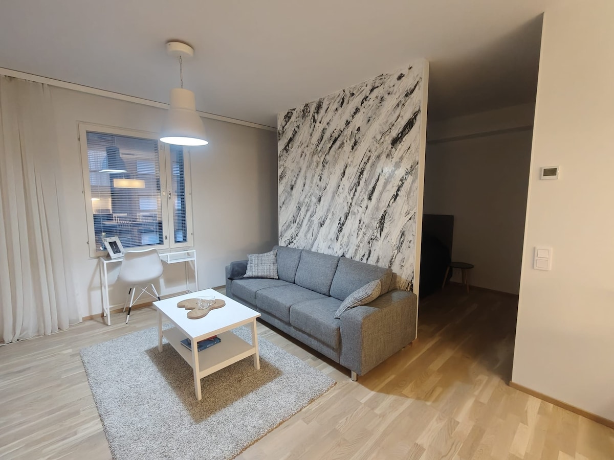 A brand new studio apartment in a lovely environment near the Turku Castle and the harbour. The city center is just a 20min walk away by the beautiful riverside. The apartment has everything you need for a short visit or a longer stay, a fully equipped kitchen, bathroom, a new larger double bed and a lovely patio. Wi-fi access will keep you connected on your trip. Guests can now also enjoy a new TV. Uusi yksiö lähellä Turun satamaa, kävelyetäisyydellä keskustaan.