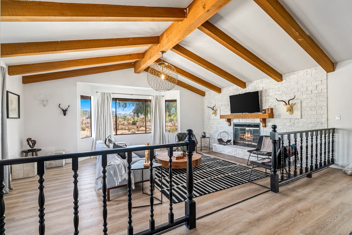 Welcome to The Hideaway, a desert escape designed for creatives, musicians, and seekers of quiet inspiration. Set on 250+ acres of desert, this open concept studio features a custom performance stage beneath high ceilings, luxury amenities and a spa-like rain shower. Open the roll-up door to a sweeping patio, fire pit, BBQ and hammocks for endless views of mountains and starlit skies. With collectable instruments and space to breathe, The Hideaway is part creative studio, part desert sanctuary.