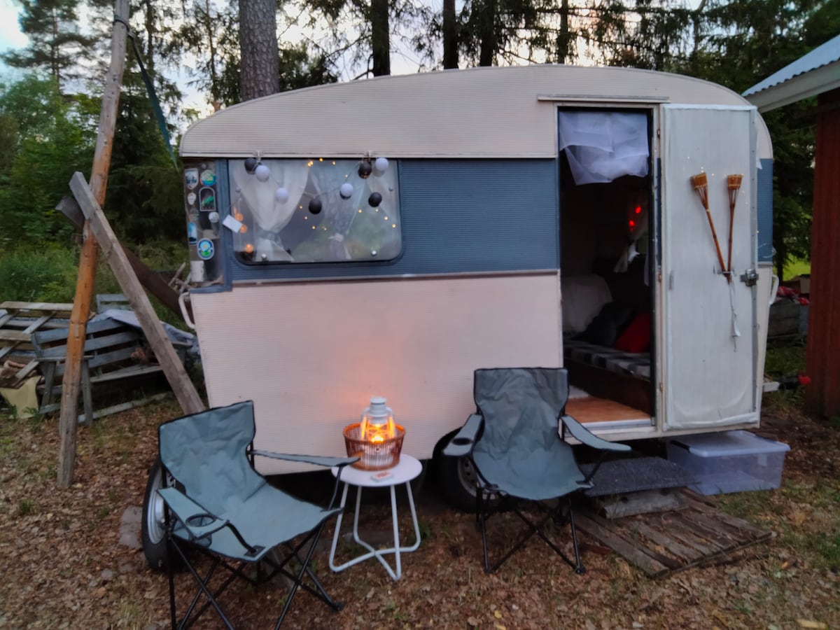 Karavan za iznajmljivanje u dvorištu kuće. Automobil može da primi 4 odrasle osobe ili, na primer, 2 odrasle osobe + 4 dece. - Frižider -peć -Električna energija - Kemijski toalet - Dvorište se može koristiti i roštiljati Nalazi se pored dobre autobuske veze. 4,5 km do centra grada. Parking mjesto Kola se iznajmljuju na Airbnb-u za smještaj u dvorištu. Posebno pitajte da li želite da iznajmite kola za putovanje, i to možete da uradite. Drvena sauna/7 e ili tuš kabina se takođe može iznajmiti odvojeno od zgrade za 2 e po osobi