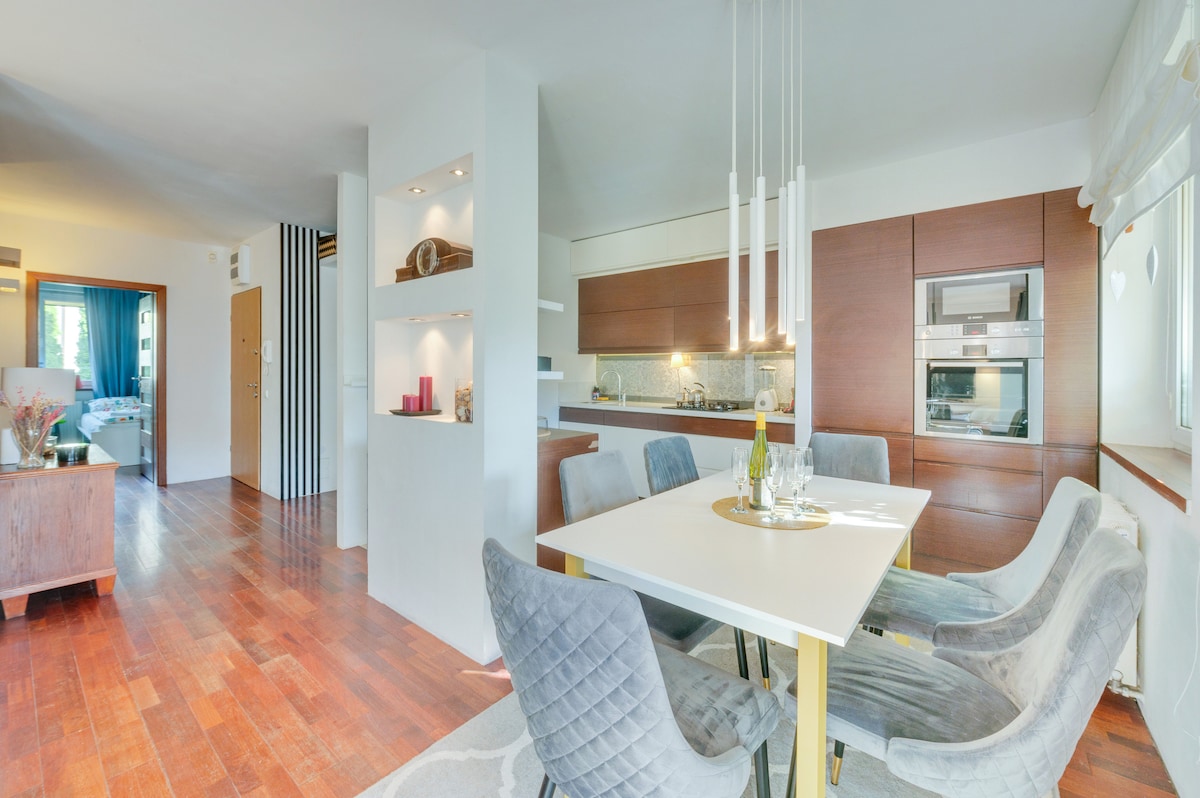 Spacious, modern apartment with a huge living room, a big balcony and a view over the city, in the heart of Lodz, but in a calm and quiet neighbourhood, located in luxurious estate. Close to the vibrant main street of the city - Piotrkowska with many restaurants and clubs. Beautiful park, tennis courts, concert and event halls, Expo Lodz, a cinema and a shopping mall in the neighbourhood, walking distance from the apartment. Have a great time in Lodz!