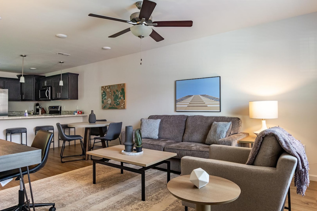 Pobjegnite u ovaj elegantni smještaj s 2 spavaće sobe s bračnim krevetima za vrhunsku udobnost. Dizajniran sa umirujućim tonovima i elegantnom estetikom, ovaj prostor nudi mirnu i privlačnu atmosferu. Uživajte u potpuno opremljenoj kuhinji, udobnom dnevnom boravku i modernim sadržajima. Savršeno za duže boravke, poslovna putovanja ili vikend-putovanje. Praktična lokacija sa jednostavnim pristupom restoranima, kupovini i zabavi. Rezervišite odmah za opuštajući boravak!