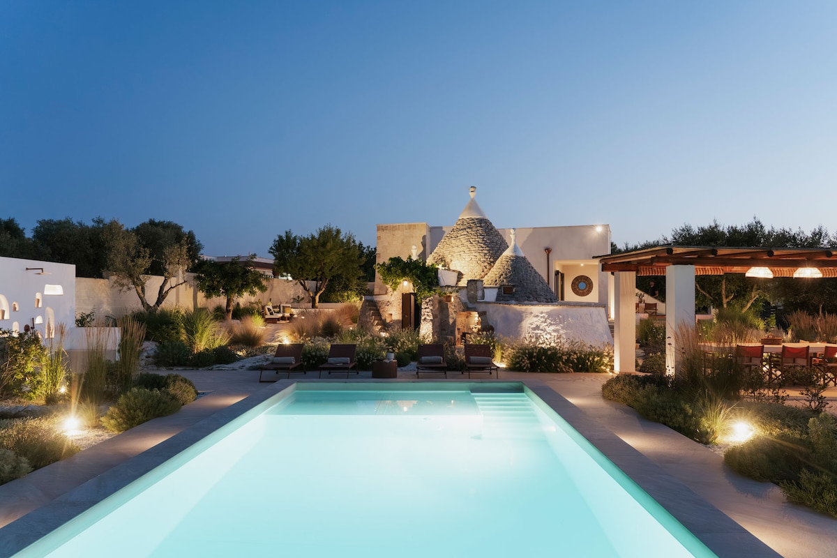 The Trullo Apulia is an exclusive property, made by recovering an original ancient historic domed house (called "Trullo Saraceno"), enriched by swimming pool, Jacuzzi and steam room for private use, in a scenic location, just 2 km from Ostuni and 10 km from the beautiful beaches of Puglia. It can accommodate up to 8 people. Note: the reservation fee does not include consumptions of electricity (0.50€/kWh), gas (5€/m3) and the tourist tax (1€/day for each person for the first 5 days) that will be calculated and paid at the end of your stay. Struttura esclusiva con piscina, idromassaggio, bagno turco, 8 posti letto, posizione panoramica, a 2 km da Ostuni e 10 km dal mare. Nota: i costi di consumi elettrici, gas e tassa di soggiorno non sono inclusi nella fee di affitto e dovranno essere calcolati e pagati alla fine del soggiorno. Italian Version Il Trullo Saraceno Apulia è una struttura esclusiva con piscina ad uso privato, in posizione collinare panoramica, a soli 2 km da Ostuni e 10 km dalle splendide spiagge pugliesi. Dispone di 2/3 Camere da letto matrimoniali, 4 bagni (di cui uno con bagno turco, vasca idromassaggio e doccia emozionale), 2 zone living (con 2 divani letto matrimoniali), 2 cucine, 2 camini e può comodamente ospitare fino a 8 posti letto. Atmosfera unica che unisce l’inconfondibile stile mediterraneo ai comfort più moderni, per un soggiorno esclusivo ed originale, all’insegna di relax, privacy e benessere naturale. La struttura è costituita da 2 unità abitative (trullo saraceno con 3 coni + lamia) totalmente indipendenti, ma comunicanti tra loro, separate da una porta con serratura. Ciascuna unità comprende una sala da pranzo con camino, TV a led satellitare e divano-letto matrimoniale, un cucinino completo di elettrodomestici (frigo-freezer, forno elettrico, lavastoviglie, lavatrice, piccoli elettrodomestici)e una camera da letto con bagno privato, completo di doccia emozionale per cromoterapia. Ideale per 2 famiglie di amici che, fatta salva la privacy, possono godere di momenti comuni di relax e divertimento, può anche essere utilizzata come unica unità abitativa, utilizzando una delle due zone living come terza camera da letto matrimoniale. Tutti gli ambienti della casa sono climatizzati e dispongono di connessione internet WiFi. Gli ospiti hanno a disposizione un parcheggio privato. L’intera struttura ha una capacità ricettiva massima di 8 posti letto, mettendo a disposizione dei suoi ospiti ben 4 bagni, di cui 2 interni completi, un’area benessere con bagno turco, aromaterapia, ampia vasca idromassaggio (che si affaccia su una suggestiva parete rocciosa), doccia emozionale con cromoterapia e servizi igienici ed 1 bagno esterno (water+lavandino) con doccia. L’esclusiva piscina a sfioro di acqua salata con idromassaggio è immersa nel verde della macchia mediterranea. Questa oasi di privacy e di relax dispone di tutto il necessario, inclusa una Zona solarium, la doccia esterna ed il bagno di pertinenza. La profondità dell’acqua della piscina risponde ai requisiti di legge per garantire la massima sicurezza anche dei più piccoli. Molteplici sono gli spazi esterni arredati e le ambientazioni minimal chic che consentono agli ospiti di pranzare o cenare su un ampia terrazza panoramica ombreggiata da un gazebo cannucciato o di gustare, appena svegli, una ricca prima colazione all’aperto, in un’area attrezzata proprio davanti alla portafinestra della propria camera da letto, respirando i profumi dei campi, nell’intimità della luce del primo mattino. Al tramonto, l’unicità del trullo e del giardino circostante, vengono ancor più esaltati dall’illuminazione serale, che vi regalerà nuove emozioni ed un fascino indimenticabile, rallegrati dai sapori inconfondibili dei cibi grigliati al barbecue. Il complesso abitativo è frutto di una recentissima ristrutturazione di costruzioni dal valore storico (il Trullo Saraceno dalla caratteristica cupola bianca è ancora più antico del trullo a cono), in cui il sapiente recupero dei materiali, delle tecniche e dei canoni tipici dell’architettura e della storia pugliese, hanno consentito un restauro di interni ed esterni che mantenesse una linea fortemente evocativa e rispettosa dei luoghi, anche nell’arredamento dai colori chiari e naturali, studiati con la massima attenzione ai dettagli e costituito da pezzi unici e originali. Il fascino della location non conosce paragoni: la costruzione si affaccia su un giardino terrazzato caratterizzato dai tipici muretti a secco, oltre i quali si apre, a perdita d’occhio, su un’area di circa 6.000 mq di pertinenza esclusiva della casa, una valle di magnifici ulivi secolari su terra rossa. Un agrumeto, un frutteto, ampie aree di macchia mediterranea tra le quali trovano spazio molte piante ed erbe aromatiche, dischiudono immagini, in un tripudio di colori e profumi di natura incontaminata che illuminano gli occhi ed allietano la mente. l frutti e gli ortaggi tipici pugliesi, totalmente biologici, sono a disposizione degli ospiti. NOTA: Trullo Apulia promuove un uso sostenibile dell'energia elettrica e dell'acqua (presenti pannelli fotovoltaici e per riscaldare l'acqua sanitaria) e ci piacerebbe che anche i nostri ospiti facessero lo stesso. Per questo motivo non includiamo i consumi elettrici in maniera forfettaria nelle spese di affitto ma saranno conteggiati secondo il consumo effettivo che verificheremo insieme, confidando in un vostro uso responsabile (per il dettaglio, vedi la sezione "Altre cose da considerare"). English Version The Trullo Saraceno Apulia is an exclusive property with swimming pool for private use, in a scenic hillside location, just 2 km from Ostuni and 10 km from the beautiful beaches of Puglia. It has 2/3 Double bedrooms, 4 bathrooms (one with a steam room, whirlpool bath and emotional shower), 2 living areas (with 2 sofas bed for 4 people), 2 kitchens, 2 fireplaces. The whole structure can comfortably accommodate up to 8