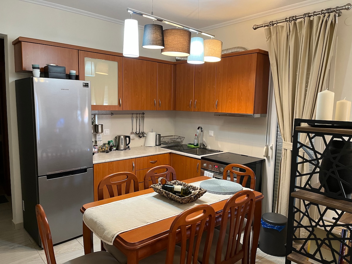 Peaceful 2-bedroom apartment with a lovely garden and a sofa bed for up to 2 people. A fully renovated (2024) and fully furnished house in the village of Krithia, Thessaloniki. Ideally located in the central square of Krithia village, just steps away from a supermarket, pharmacy, and the local general practitioner. Only 10 minutes by car (9 km) from Prokopidis military camp near Assiros — ideal for military personnel.