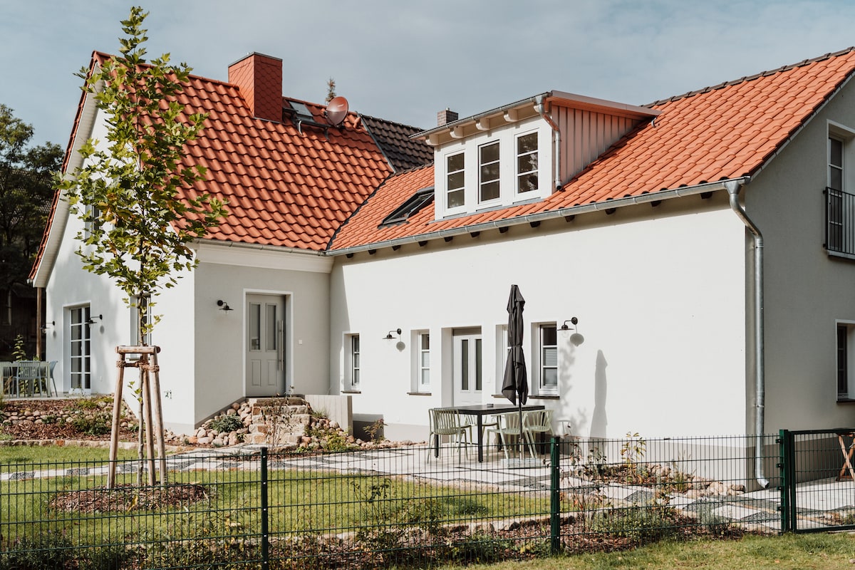 Are you looking for a stylish accommodation, for up to 5 guests, for your a relaxing holiday in the nature at Scharmützel lake? Then we welcome you in our apartment in Wendisch Rietz, only 70km from the centre of Berlin. Our recently built apartment with its two bedrooms, spacious bathroom, kitchen and living area, terrace with heated hot tub, sauna and view of the surrounding nature, invites you to relax.