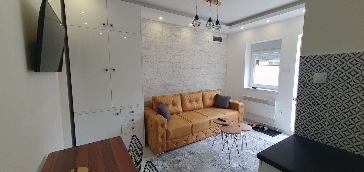 Moderan i udoban stan. Parking je javan u plavoj zoni ( 0,50e na sat). Apartman ima 25 m2 i ima veoma dobru lokaciju. Apartman ima bračni krevet, kuhinju,kupatilo i terasu. Apartman je veoma dobro opremljen, a on ima sve što vam je potrebno za boravak u kratkom ili dugom periodu. Centar grada udaljen je 15 minuta hoda, a Dunavska reka sa velikom peščanom plažom udaljena je samo 20 minuta. Novi popularni tržni centar "Promenada" udaljen je 5 minuta vožnje. Pekara, supermarketi su blizu...
