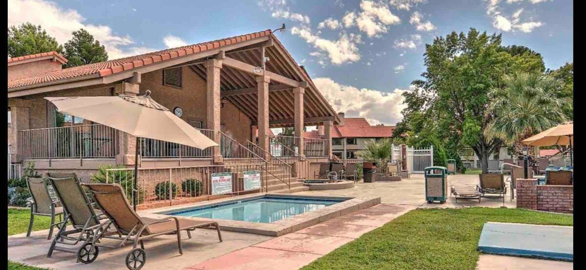 POGLED OD MILION DOLARA!! Dođite da se igrate u crvenim stijenama i boravite u našem prelijepo uređenom kondominijumu 2b/2b. Prostrana jedinica može udobno da spava 6 osoba. Dva ROKU televizora s velikim ekranom, veliki sto za ručavanje i radne potrebe i potpuno opremljena kuhinja. Sadržaji u sportskom selu uključuju bazene, hidromasažne kade, dječji bazen, dasku za miješanje, prostoriju za vježbanje, tenis, racquetball i terene za pikbol. Staze za planinarenje i biciklizam i kvalitetan golf u St. Georgeu u roku od nekoliko minuta.