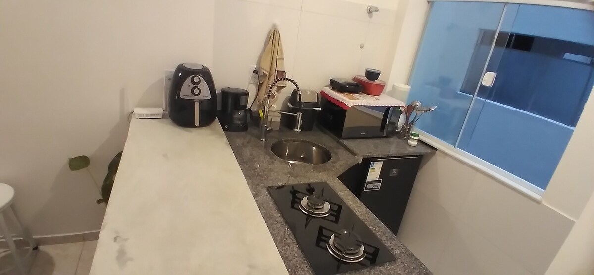Kitnet u centru Sao Lurenca, nekoliko minuta od Parque das Águas, šetališta, supermarketa, apoteka i restorana. Nalazi se u zgradi Jina, ima lift, konsijerža, prostore za odmor i besplatan Wi-Fi. Smještaj je opremljen posteljinom, jastucima, ćebadima, kuhinjskim priborom, posuđem, čašama, električnim šporetom, mikrotalasnom pećnicom, TV-om s internetom, mini barom, privatnim kupatilom i udobnim bračnim krevetom.