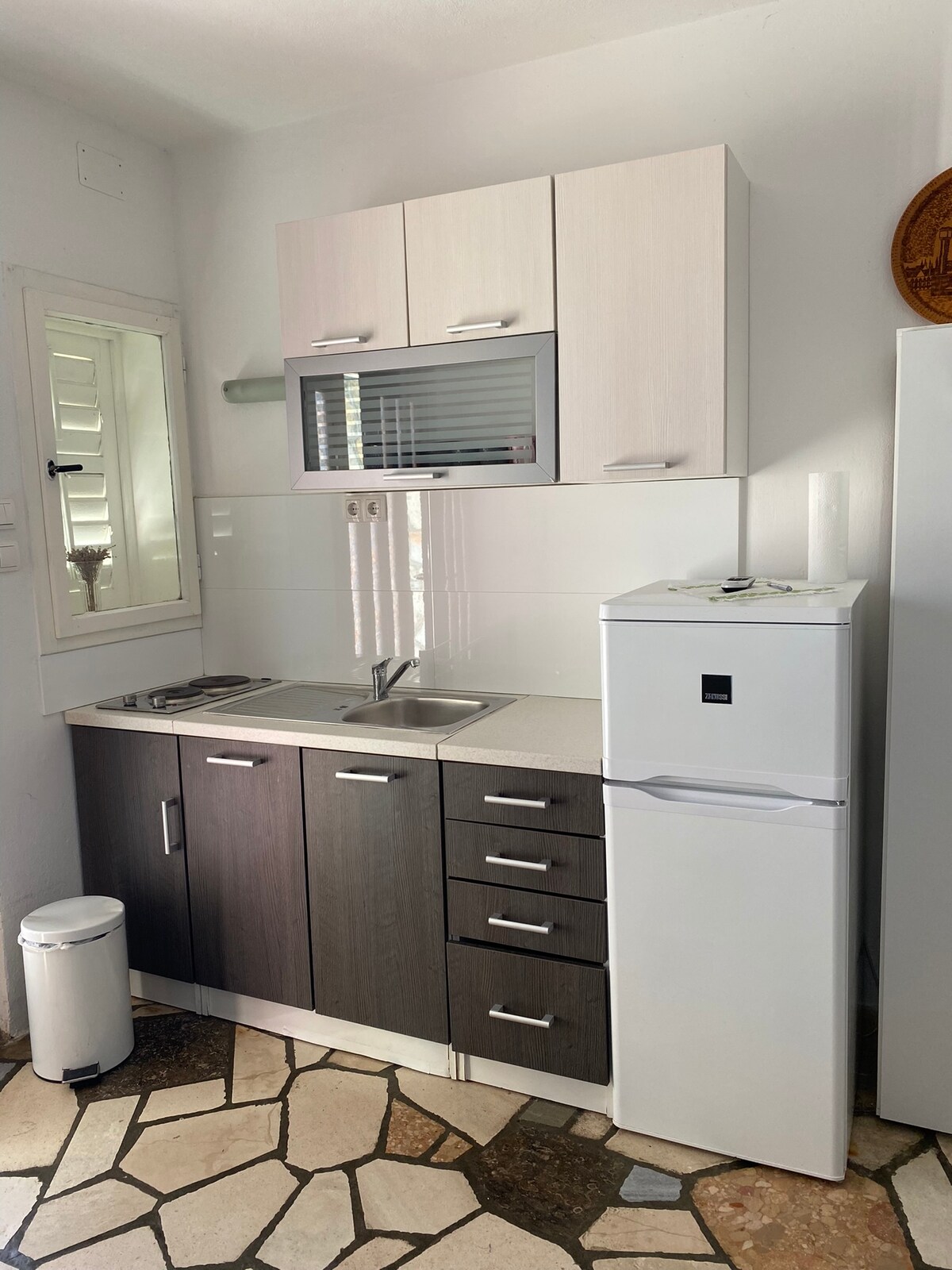 Naš mali raj se nalazi na samoj obali mora, ima direktan ulaz na plažu i odličan pogled na more. Dali smo sve od sebe da 35m2 bude savršeno za do 4 putnika. Dnevni boravak i kuhinja su kompletno opremljeni sa puno detalja i sunca. Na balkonu (10m2) možete uživati u malom salonu u hladu 70 godina starog bora. Spavaća soba ima 1 bračni krevet i 1 je na potkrovlju (ima odličan pogled na more). Kupatilo ima tuš kabinu. Uključeno je 1 parkirno mesto.