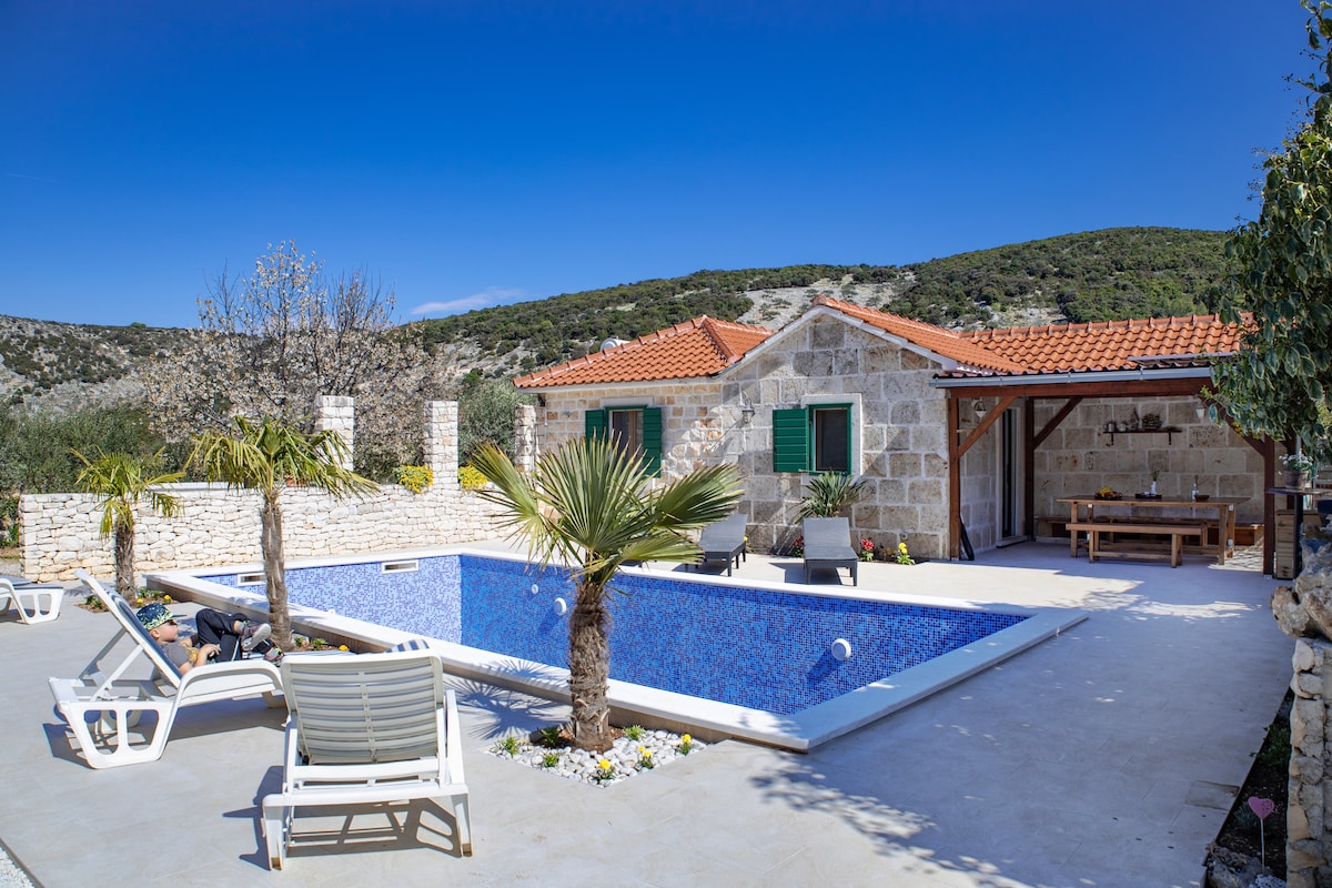 Naša kamena kuća s bazenom se nalazi na prekrasnom, zelenom otoku Braču, u blizini etno-eco sela Dol. Okružena je stablima maslina, mirno je, puno prostora za djecu, kao i kućne ljubimce. U selu Dol, koje je udaljeno 10 min.hoda, nalaze se i dva restorana. Udaljeno 3 km se nalazi mjesto Postira, sa više prodavaonica, hotela, restorana, plaža, rekreacija za djecu. Gosti mogu uživati u šetnjema prirodom, grilanju, druženju.