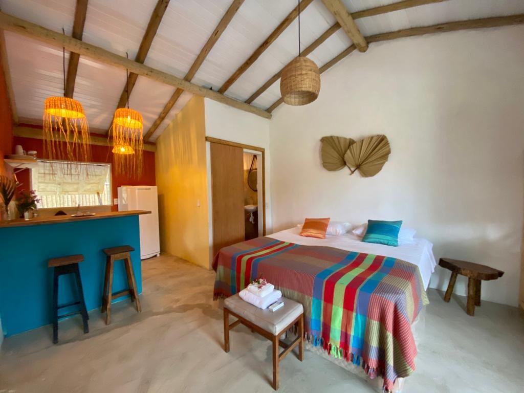 Sezonski bungalov u blizini plaža i centra Itacarea, na mirnom mestu okruženom bujnom tropskom vegetacijom. Prostrani apartman sa bračnim krevetom i krevetom za jednu osobu, opremljen klima-uređajem, TV-om, Wi-Fi internetom i kuhinjskim prostorom sa mikrotalasnom rernom, minibarom, aparatom za kafu i indukcionom pločom za kuvanje. Balkon sa visećom mrežom okrenutom prema Atlantskoj šumi.