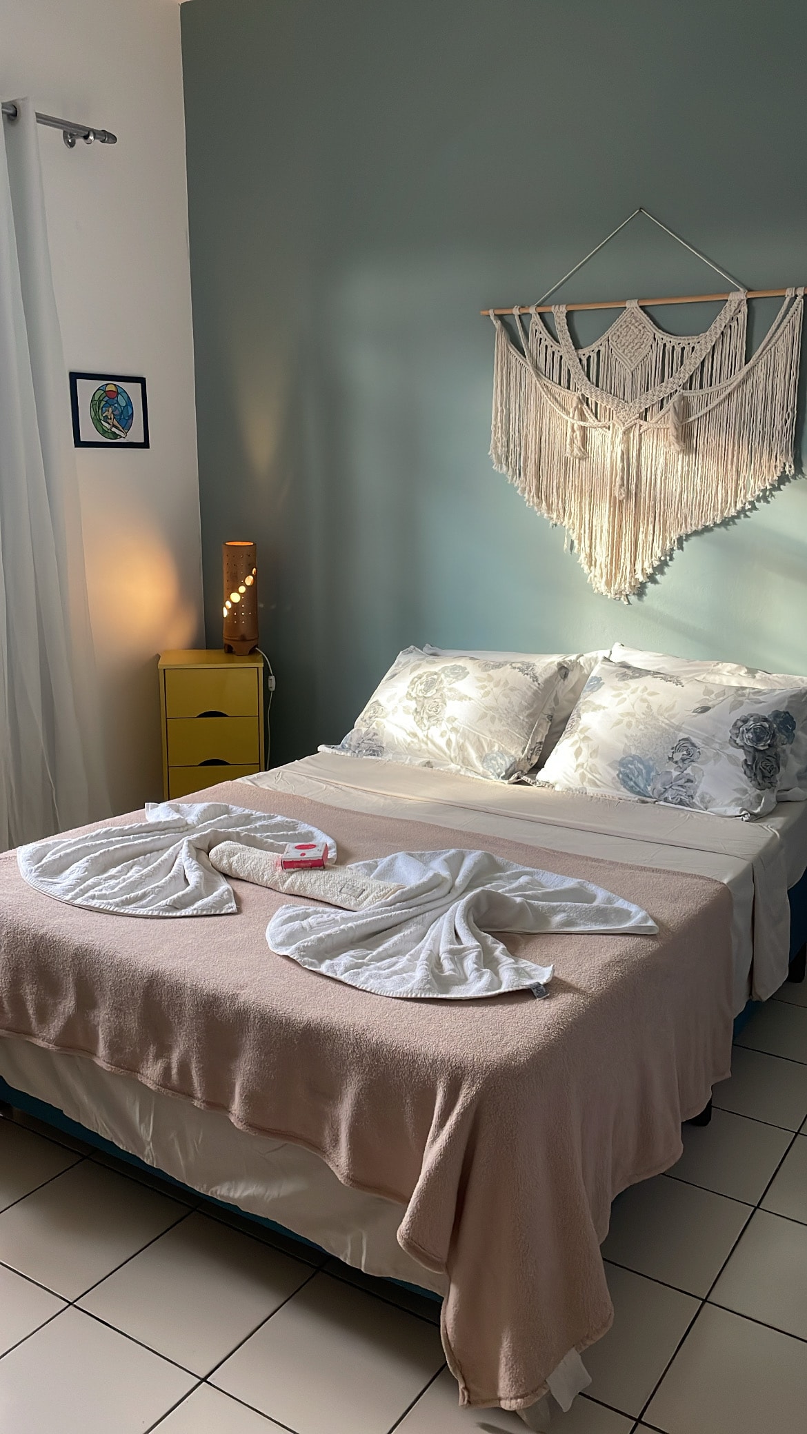 Vaša porodica će biti blizu svega boraveći u ovom dobro pozicioniranom smeštaju u odmaralištu Žakaraipi/ES. Objekat može da primi do 8 osoba, ima tri spavaće sobe, jednu sa kupatilom, dve spavaće sobe i zajedničko kupatilo. Praia do Amigão, na morskom terenu i 8 minuta hoda do Arene Žakareipe (sportski prostor). Nalazi se na plaži Amigao, blizu plaže Solemar (takmičenje u surfovanju). Ne obezbeđujemo posteljinu, kupku, obezbeđujem 8 jastuka.