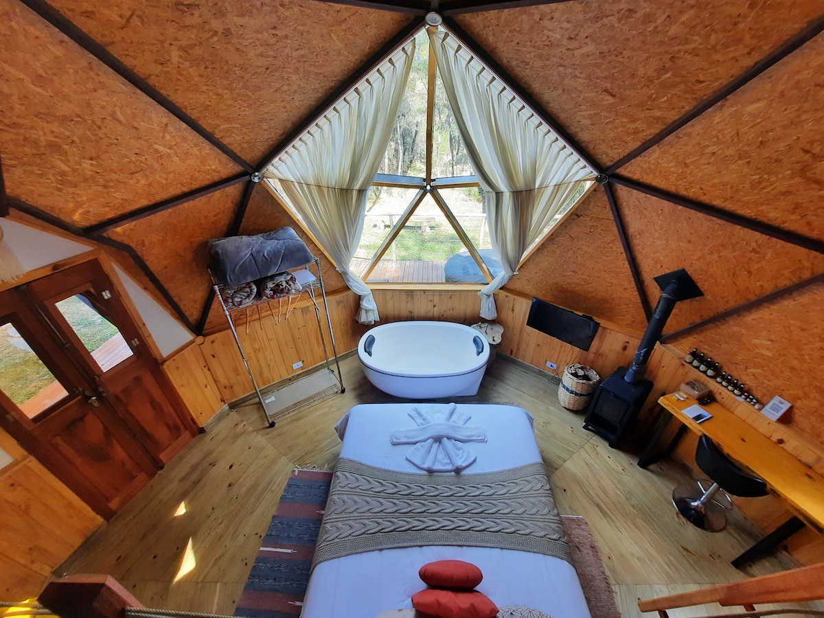Doživite jedinstveno iskustvo boravka u našoj geodetskoj kupoli u Sera da Mantikeiri, okruženi šumom. Opustite se u hidromasažnoj kadi pod zvijezdama, pored udobnog kamina. Sve je dizajnirano tako da izvučete maksimum iz kupole. U spoljnom prostoru uživajte u grejanom bazenu sa hidromasažom i roštilju, uz zvuke prirode. Noću se odmorite na našem krevetu sa termalnom čaršafom. Dobro došli