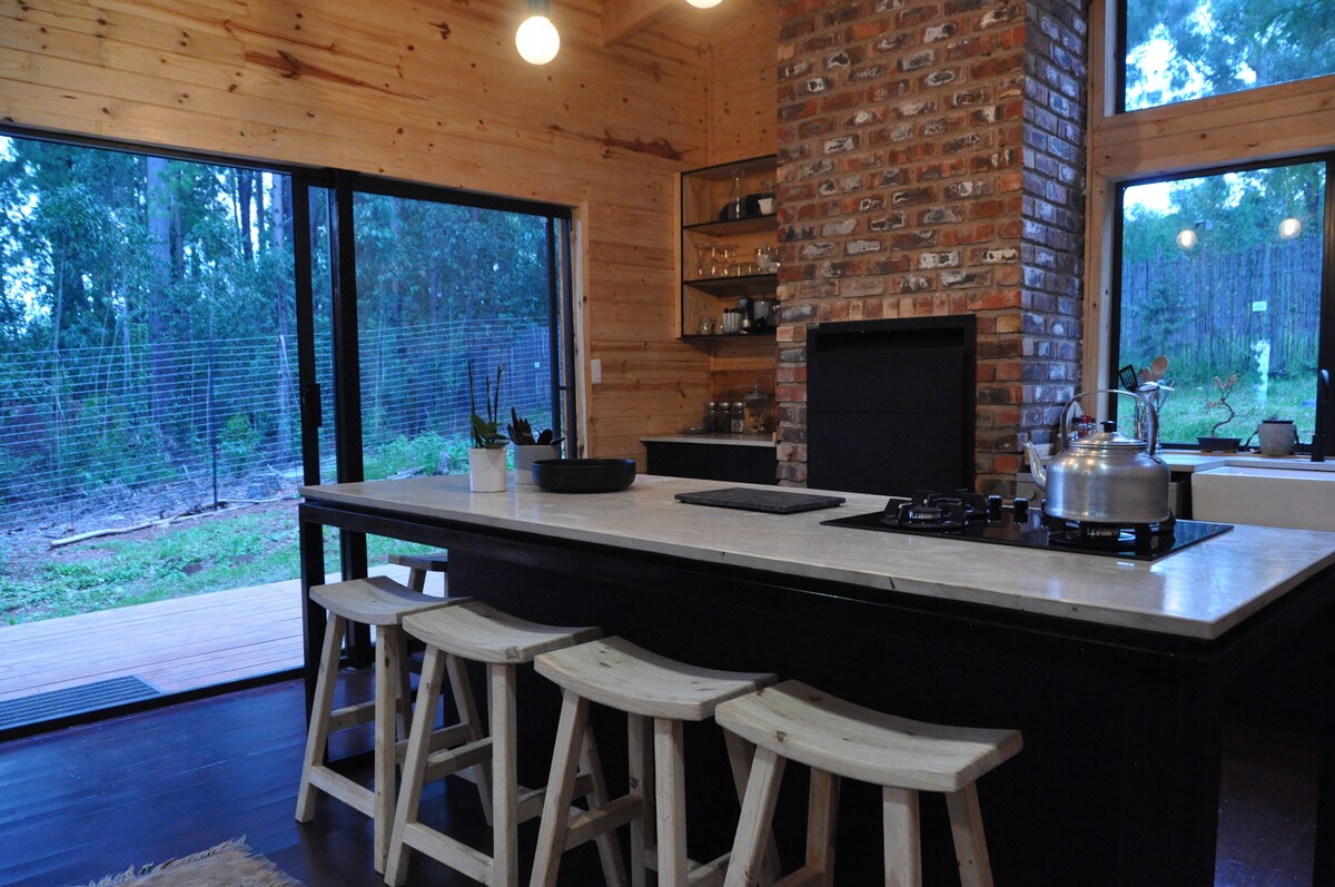 Luxury timber cabin situated in the forest in Dullstroom, Mpumalanga. The house has large widows providing a 360 view of the surrounding forests, giving guests a calm and relaxed atmosphere. Walking distance from restaurants, shops, hiking, flyfishing, and mountain biking trails. 1 bedroom with a double bed with a futon bed in the study that can accommodate an extra 2 guests. Safe and secure parking available.