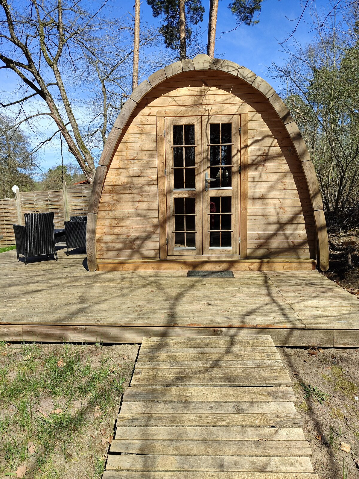 Auf einer Anhöhe, eingebettet von alten Bäumen, steht 1 von 3 unkonventionellen Hütten mit je 2 Schlafplätzen. Bei jedem Wetter (außer im Winter) kann die Hütte Campingfreunden, Fahrradfahrern oder Kurzentschlossenen eine Übernachtung, als Alternative zum Zelt, bieten. Einfach nur einen Schlafsack und ein Handtuch mit in das Gepäck. Der Komfort besteht aus, einem Dach über dem Kopf, einem Platz zum Schlafen, einem schönen Lagerfeuer und einer warmen Außendusche mit separatem WC.