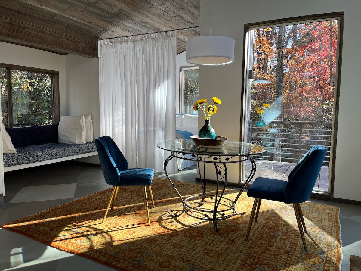 Smješten na mirnom planinskom grebenu. Udobna atmosfera. Savršeno za jednog putnika ili par. Slušajte potočić dok se opuštate na natkrivenom tremu ili velikoj terasi sa pergolom. 15 minuta vožnje do državne rekreacione šume DuPont ili nacionalne šume Pisgah. 10 minuta vožnje od centra Brevarda. Potpuno opremljena kuhinja, W/D i kafić. Opustite se sa dvostrukim naslonjačem ili naslonjačem. Wi-Fi, Roku TV i električni kamin u dnevnoj sobi. Okrug Transilvanija ima više od 250 vodopada.