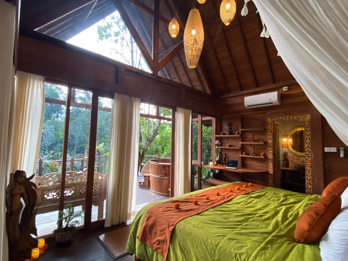 Some guests find us by searching. Most find us because something pulled them here. Hale Nai'a is a private Javanese wood bungalow perched above the Petanu River, with an outdoor jacuzzi, small kitchen, yoga space, king bed on the main floor, and a queen loft above. Stand on the terrace and you can see the river below. Come solo, with a partner, or with family — close enough to Ubud, far enough to forget it. Fifteen minutes by car to the center on a good day, give or take traffic.