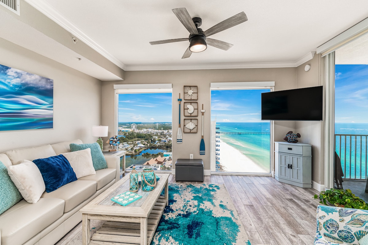 Stan na 16. spratu u Tajdvoteru sa prelepim pogledom na okean sa balkona. Ovaj raspored od 2 spavaće sobe + krevet na sprat prima 8 osoba i idealan je za porodice i grupe. Karakteristike uključuju 3 kupatila, apartman sa velikim bračnim krevetom, spavaću sobu sa francuskim krevetom, krevet na sprat, kauč na razvlačenje, brz Wi-Fi, pametni TV od 70 inča, mašinu za pranje/sušenje veša i potpuno opremljenu kuhinju. Jednostavan pristup plaži, šetnja do parka Pier i pogodnosti odmarališta, uključujući bazene, đakuzije, restorane i Starbucks. Obezbeđene su jasne smernice za prijavu, uključujući savete za izbegavanje gužve u liftu.