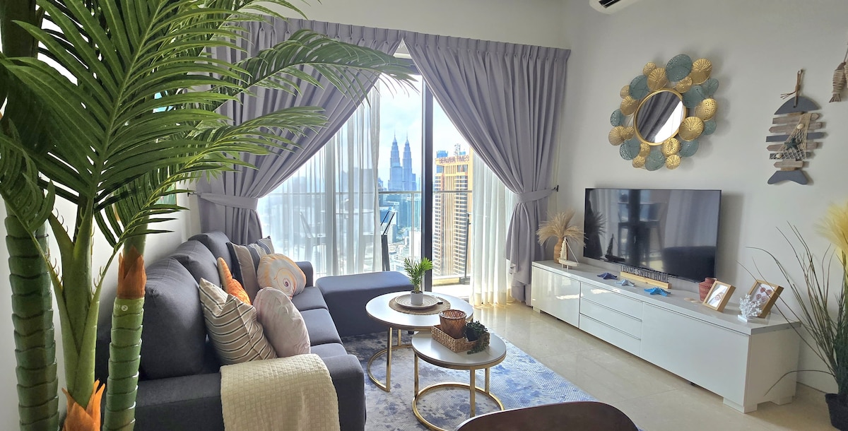 Sit back and relax in this calm, stylish space. Why Seashell suite at Lucentia Residence - Best views of KL - Beautifully decorated with a fun spirit - Centrally located & attached to public transit hub - Fast wifi - 2 TVs with Netflix & others - 2 gorgeous pools - Family friendly with baby crib & highchair - Gym, pool table, BBQ pits, piano - Garage parking - Recommended to Sleeps 6, max 8 person - LaLaPort Shopping Mall & the WOW entertainment street are attached - Grocery, drug store & Cinema