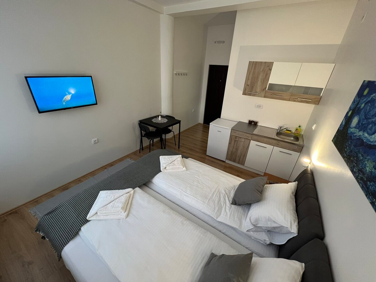 Apartman se nalazi u strogom centru grada u izuzetnom mirnom delu, a nadohvat svega u okruženju. Opremljen je svim segmentima pravog biznis mesta, brzim industrijskim WiFi, radnim prostorom i tehničkim detaljima. Apartman je izuzetno prijatan, udoban, topao i besprekorno čist. Poseduje balkon terasu, centralno grejanje, klima uređaj, prostranu dobro opremljenu kuhinju, SMART TV, bežične punjače, MINI BAR, Mikro talasnu pećnicu, ovlaživače i osveživače vazduha i još mnogo toga za pravo uživanje.